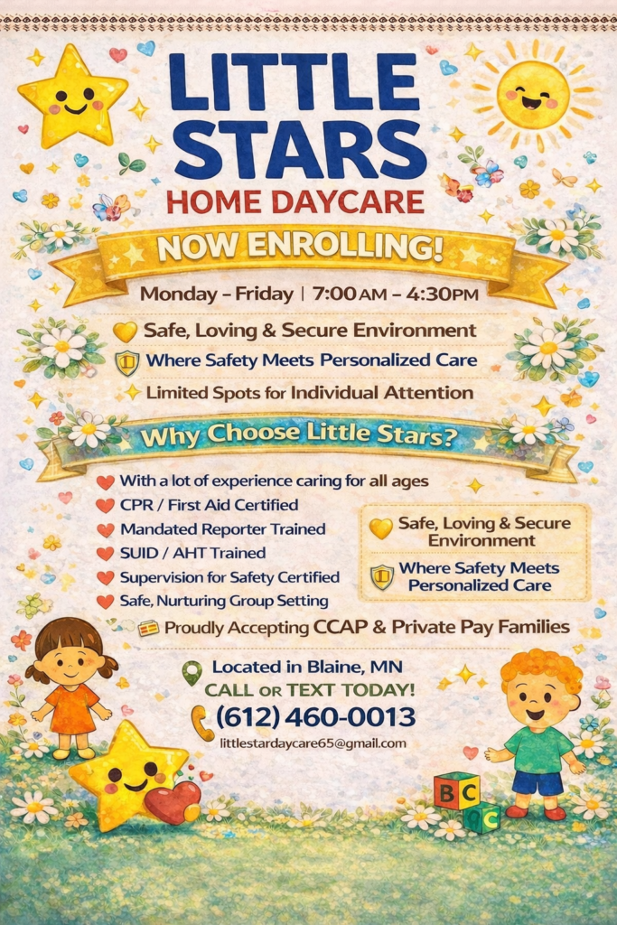 Welcome to Little Star Home Daycare LLC — where every child is valued, supported, and encouraged to shine. Located in Blaine, Minnesota, we provide a structured, small-group learning environment designed to give each child individual attention, emotional security, and strong early learning foundations.